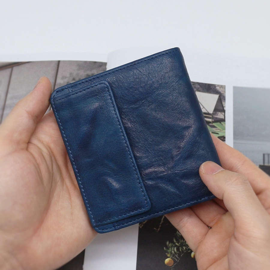 ネイビーブルーの上質なレザーを使用したミニ財布は、手のひらにすっぽり収まるコンパクトさが魅力です。