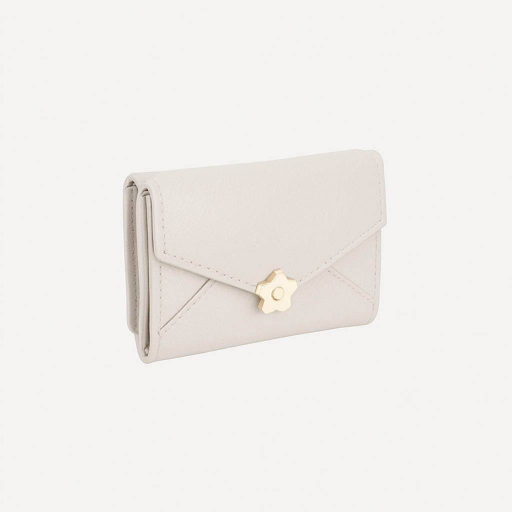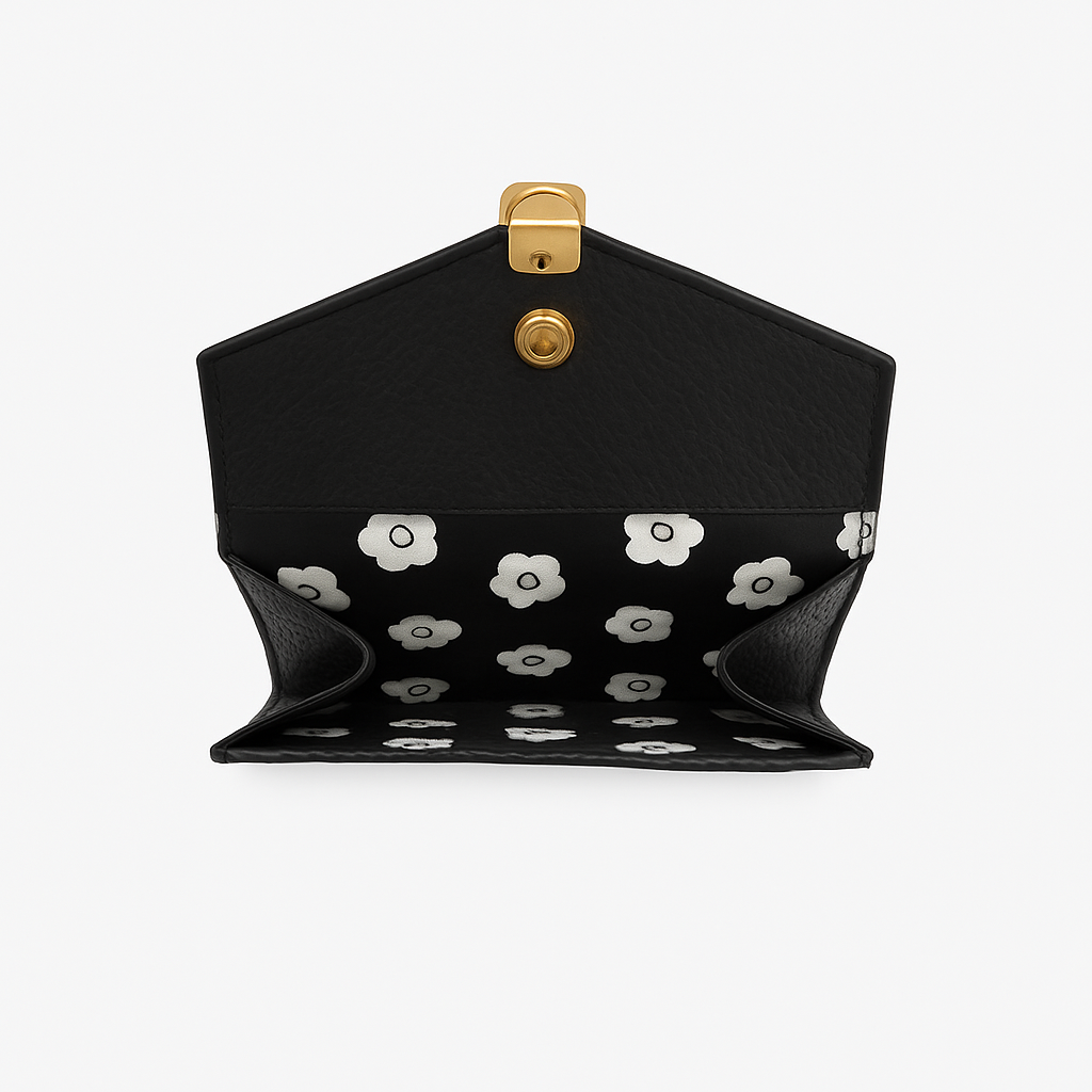 中央に配置された花モチーフの金具が可愛らしさと上品さを演出し、女性らしいデザインに仕上げました。