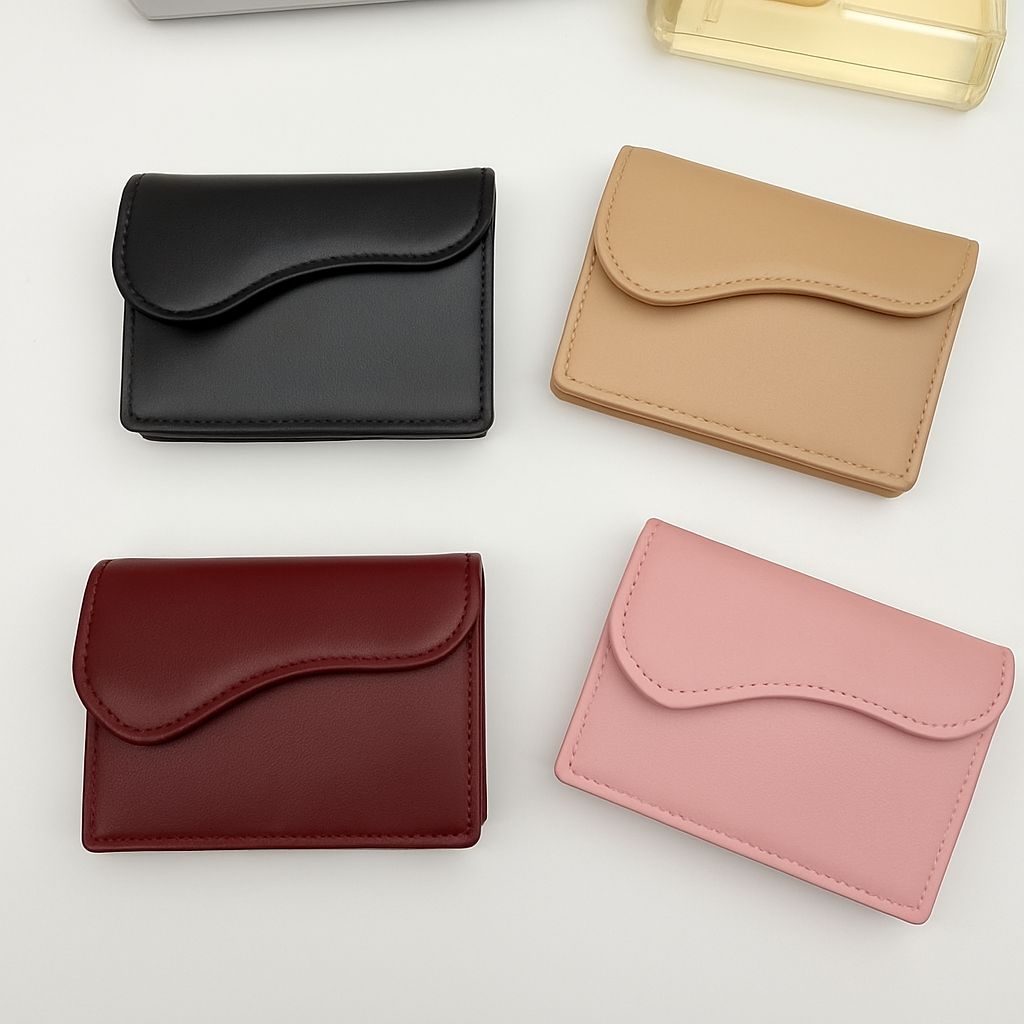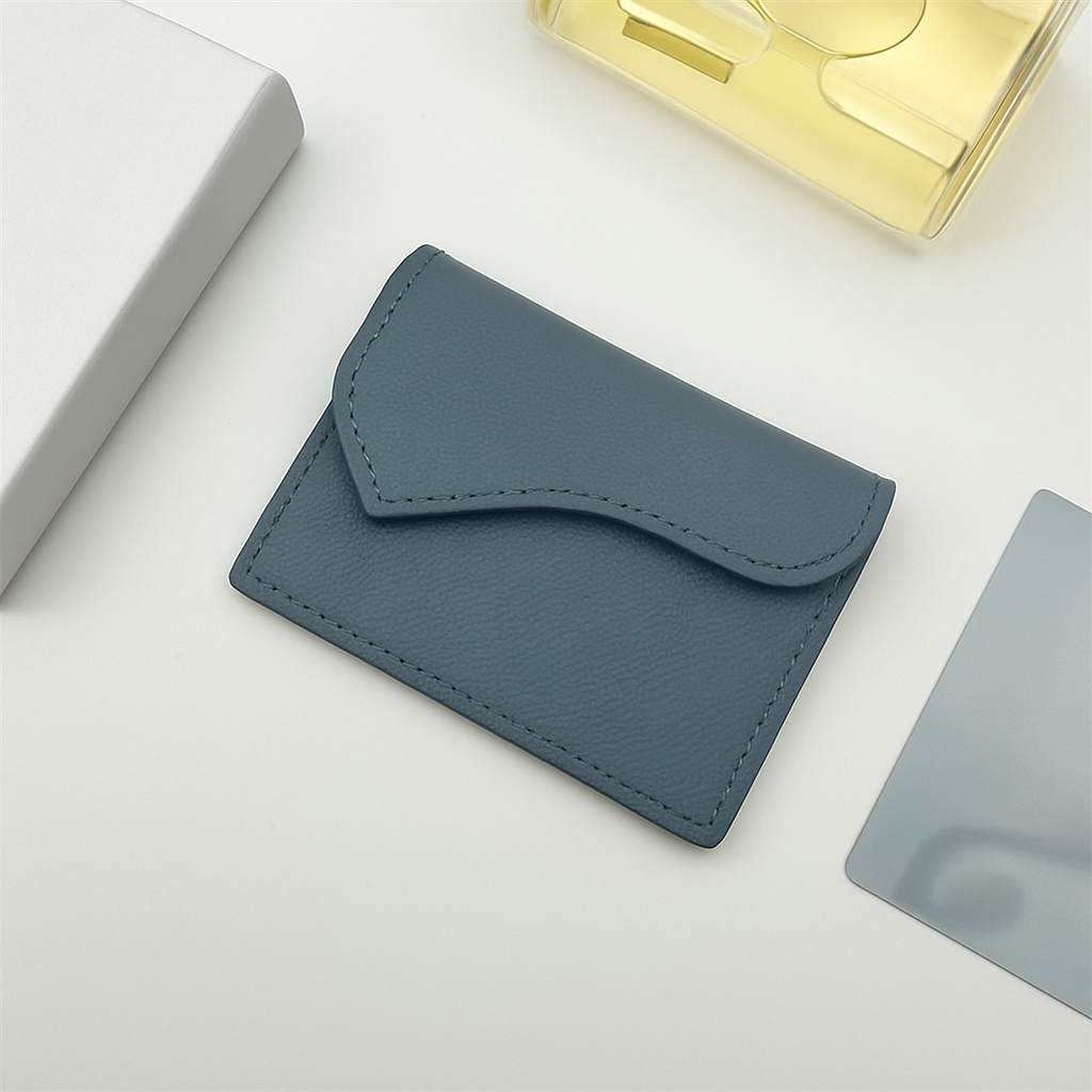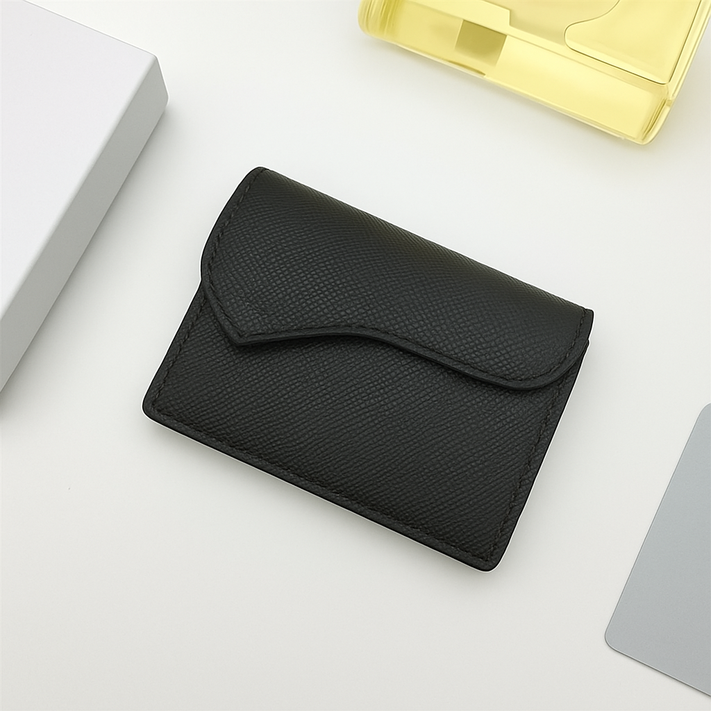 上質な革素材を使用した革 財布シリーズのコンパクトなカードケースです。 封筒のようなエンベロープデザインの曲線的な蓋が特徴的で、洗練された印象を与えます。 細かな型押し加工が施された革は手触りも良く、使い込むほどに風合いが増していきます。 名刺や各種カード類をスマートに収納でき、ビジネスシーンからプライベートまで幅広く活躍します。 スリムな設計でバッグやポケットにもすっきり収まる実用性の高い逸品です。