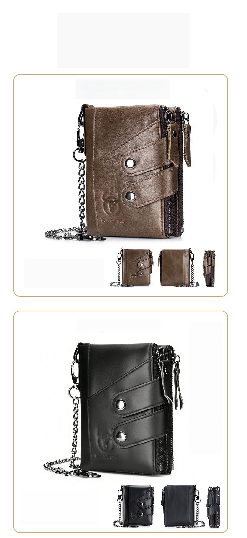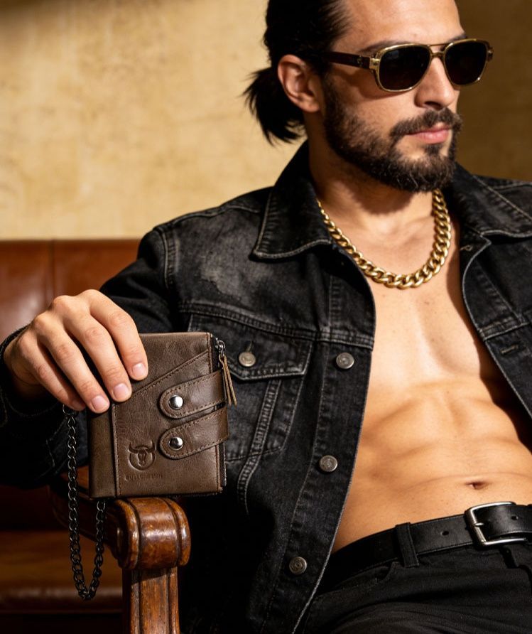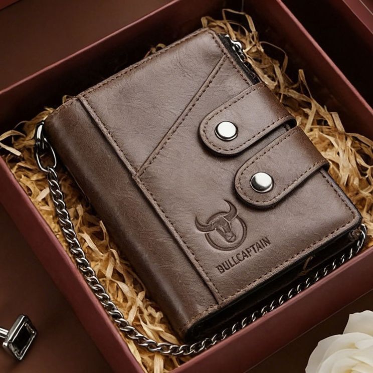 上質な革 財布として日常使いに最適なレザー二つ折り財布です。 二つのボタン留め具で安心の収納力を実現し、カードポケットや札入れ、小銭入れを備えた多機能設計が魅力です。 チェーンストラップ付きで紛失防止にも配慮しました。 丁寧なステッチワークと滑らかな質感が手に馴染み、使い込むほどに風合いが増していきます。 収納力と携帯性を兼ね備えた実用的な逸品です。